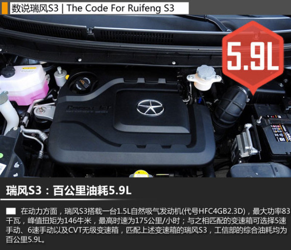 在动力方面,瑞风S3搭载一台1.5L自然吸气发动机(代号HFC4GB2.3D),最大功率83千瓦,峰值扭矩为146牛米,最高时速为175公里/小时;与之相匹配的变速箱可选择5速手动、6速手动以及CVT无级变速箱,匹配上述变速箱的瑞风S3,工信部的综合油耗为百公里5.9L。