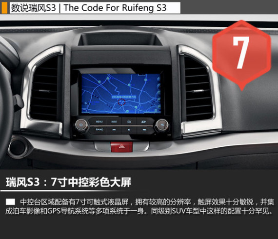 瑞风S3车内中控台区域配备有7英寸触摸屏,拥有较高的分辨率,触控效果亦十分敏锐。并集成泊车影像和GPS导航系统于一身。同级SUV车型中这样的配置并不多见。除此之外,瑞风S3还配备有自动恒温空调和花粉过滤功能,令车内乘客实现更加优质的空气环境。
