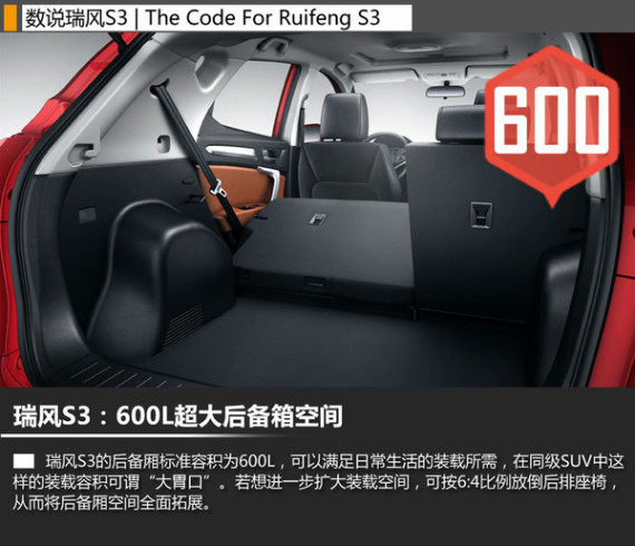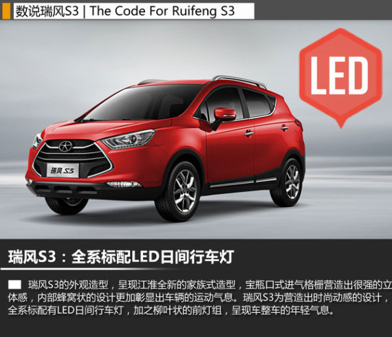 据了解,这款瑞风S3是针对85后年轻消费群体打造的城市型SUV,定位为易驾SUV。新车基于A30的轿车平台打造,为此这款小型SUV的车身尺寸与和悦A30接近。长宽高分别为4325·1765·1660mm(含行李架),轴距达到2560mm。与同级热销SUV长安CS35和长城M4相比,可谓不相伯仲。