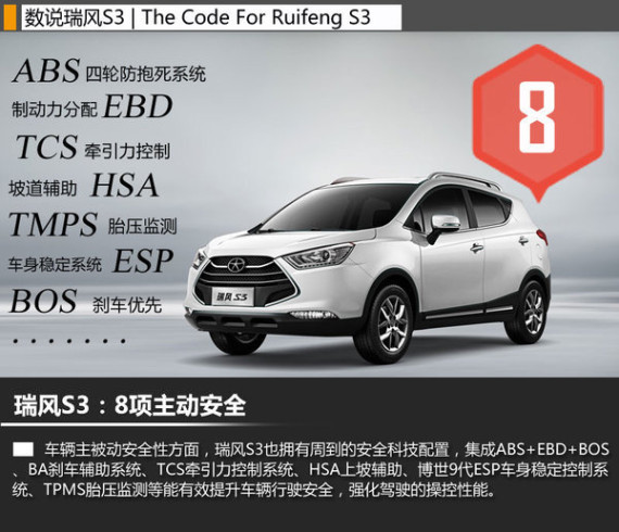 车辆主被动安全性方面,瑞风S3也拥有周到的安全科技配置,集成ABS+EBD+BOS、BA刹车辅助系统、TCS牵引力控制系统、HSA上坡辅助、博世9代ESP车身稳定控制系统、TPMS胎压监测等能有效提升车辆行驶安全,强化驾驶的操控性能。同时在被动安全方面,全车配备有6安全气囊、笼式高强度承载车身,在同级车型中这样的安全配置可谓独一无二。