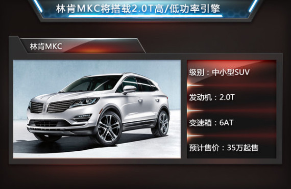 林肯另一款新车MKC是一款中小型SUV。该车采用了最新的家族式设计风格,多条幅的镀铬前格栅与大灯相连,并且引入了LED日间行车灯。尾部线条同样十分饱满,贯穿式的LED尾灯看上去具有不错的视觉效果。动力方面,林肯MKC搭载高、低功率2.0L EcoBoost汽油直喷涡轮增压发动机。高功率版最大功率为176kW,峰值扭矩为366Nm,低功率版最大功率149kW,峰值扭矩为350Nm。与发动机匹配的是6速手自一体变速箱。