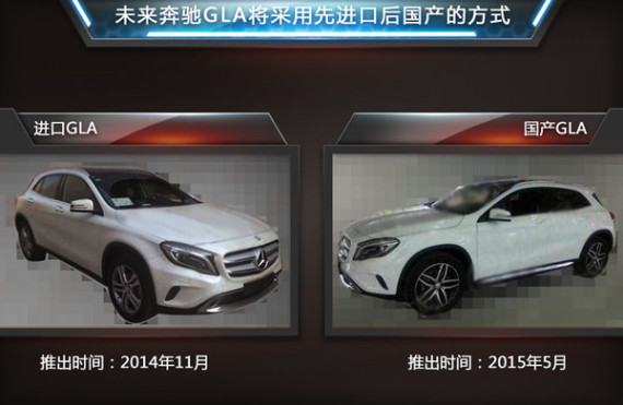 奔驰GLA作为该品牌旗下首款紧凑SUV车型,未来将采用先期进口随后国产的方式销售,进口GLA将在今年年内正式上市,国产GLA则要等到明年3月下线,随后在5月上市。其中,国产GLA也将成为北京奔驰基于MFA前驱平台投产的首款车型,上市后将竞争对手锁定为宝马X1和奥迪Q3,给豪华品牌带来更加激烈的竞争。(网通社 2014年10月16日 北京报道)相关文章阅读:·奔驰将推全新轿跑车 竞争A5/或定名CLC2014-10-15·奔驰将推全新入门级跑车 或定名“SLA”2014-10-13·奔驰MFA平台国产化签约 首款车明年投产2014-10-11