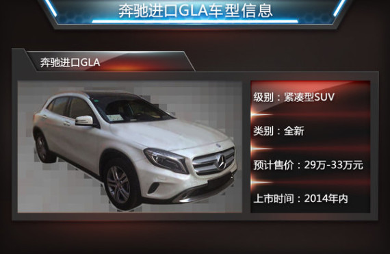 奔驰GLA作为该品牌旗下首款紧凑SUV车型,一直受到比较广泛的关注外观方面,奔驰进口GLA将延续海外版的设计细节,动感的前脸造型,犀利的前大灯融入LED日间行车灯,双横幅进气格栅以及金属镀铬装饰。网通社走访多家奔驰4S店后获悉:进口的GLA车型目前已经到达国内,最快将在2014年10月就可以正式推出,关于售价方面,入门版的GLA 200车型预计售价在29万元左右。