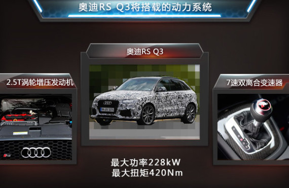 奥迪RS Q3将搭载大众发动机序列中2.5升五缸涡轮增压发动机,并且经过重新调校,动力更加强劲。最大输出功率228kW,最大扭矩420Nm。传动方面,则有望匹配一台奥迪S-tronic 7速双离合变速器,并采用全时四驱系统。凭借良好的动力总成,RS Q3可在5.5秒内完成0-100km/h的加速,(电子限速)最高可达250km/h。(网通社 2014年10月17日 北京报道)