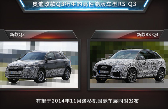根据奥迪相关规划,其将在2014年洛杉矶车展期间,除了将带来新款Q3车型外,其衍生车型RS Q3高性能版也有望同时亮相。新车的外观设计与改款Q3基本相同,家族化的前脸,中网采用奥迪RS车型特色的蜂窝式格栅,雾灯位置也选择了大面积的进气格栅,凸显运动感。