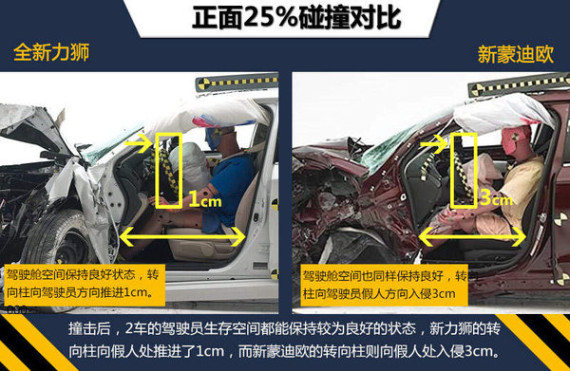 因小面积碰撞的撞击力较为强大,2车的车身结构发生不同程度的变形,其中转向柱、仪表板、铰链柱等部件发生不同程度入侵。全新力狮的车身部件虽有一定范围变形入侵,但驾驶舱空间依然保持相当良好的状态;其中下端车门铰链柱入侵范围最大,为9cm;仪表板下端部件入侵6cm,转向柱向模拟驾驶员假人推进了1cm。新蒙迪欧的下端车门铰链柱入侵16cm,较新力狮多出7cm;仪表板下端部件同样入侵6cm,转向柱则向模拟驾驶员假人推进了3cm,但并未伤及胸部。