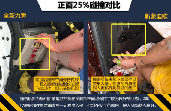 碰撞后全新力狮和新蒙迪欧的驾驶员腿部空间均受到车门铰链柱、仪表板等部件的不同程度变形入侵,但都保持基本良好的状态。全新力狮车内模拟驾驶员假人的腿部虽然在撞击中碰触到仪表板部件,但并没有受到伤害。而新蒙迪欧装备的膝部气囊在碰撞中及时弹出发挥了防护作用,保护模拟驾驶员假人的膝部和小腿避免撞击到入侵的车内结构而产生的伤害。碰撞后数据读数显示,2车内假人腿部均保持完好。