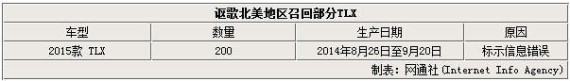 根据autoguide公布的消息,此次北美地区召回车型为2015款TLX,其生产日期区间为2014年8月26日至9月20日,共涉及200辆车。讴歌汽车表示,TXL所存安全隐患不是设计或零部件缺陷,但本着对消费者认真负责的态度还是会进行召回,更换新的标示。除此之外,目前讴歌官方未收到有关标示错误而引发的车辆事故报告,召回计划将于近期启动。