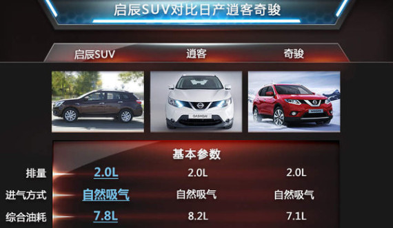 启辰SUV是基于日产奇骏-逍客平台打造的一款全新车型。此次预计推出6款新车,动力上均搭载2.0L自然吸气发动机,搭配CVT无极变速器。额定功率可达到106Kw,百公里综合耗油仅为7.8L。与奇骏2.0L引擎7.1L的耗油量差距并不大,而相比逍客2.0L车型8.2L的综合油耗更为优势。