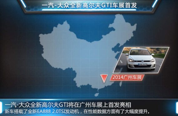 随着第七代高尔夫 (配置|询价)的在华投产,其众多家族衍生产品也将陆续引入国内。一汽-大众全新高尔夫GTI将于2014年广州车展上进行首发亮相,新车在外观方面有诸多细节的调整。网通社从一汽-大众官方了解到,全新国产高尔夫GTI基于大众MQB平台打造,有望在2015年年初正式上市销售。动力方面,新车搭载全新EA888 2.0TSI发动机,性能数据方面有了大幅度提升。