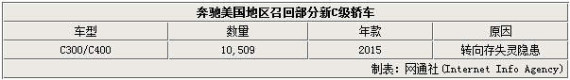根据NHTSA公布的消息,此次奔驰召回车型为2015款奔驰C级,具体车型是C300和C400,数量为10,509辆。奔驰美国公司表示,目前在美国地区未收到有关转向失灵隐患而引发的事故报告,而国外有2起已知的事故。召回计划将于近日启动,解决方案则是免费为车主进行检查维修,必要时更换相关零部件。
