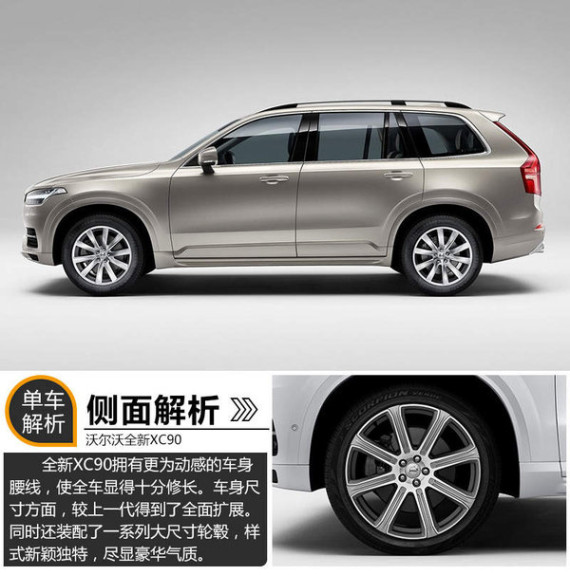 从新车侧面观察,全新XC90拥有更为动感的车身腰线,令整车显得十分修长。在车身尺寸方面,全新XC90的长宽高分别为4950*2140*1775mm,轴距达到2984mm。较上一代XC90车型而言,整车尺寸得到了全面拓展;与同级热销豪华SUV如宝马X5、奥迪Q7等相比,沃尔沃全新XC90同样也有着很大的优势。