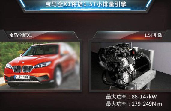 在动力方面,全新X1除有望延用现款车型所搭载的N20系列2.0T发动机外,还或将新增一款宝马最新研发的1.5T发动机,其应用了全铝合金缸体、缸内直喷、Valvetronic可变式气门正时等多项先进技术,根据调校的不同最大功率在88-147kW之间,最大扭矩则为179-249N·m。而根据宝马的相关规划,该款全新引擎也将在华实现国产。(网通社 2014年11月14日 北京报道)