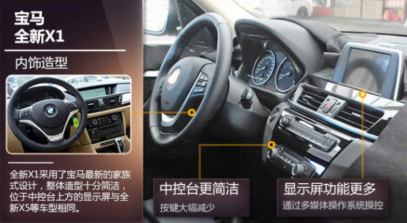 内饰方面,全新X1采用了宝马最新的家族式设计,整体造型十分简洁,位于中控台上方的显示屏与全新X5等车型采用了相同的设计,而在车辆的中控台区域按键数量明显减少,并通过全新iDrive多媒体操作系统进行操控。