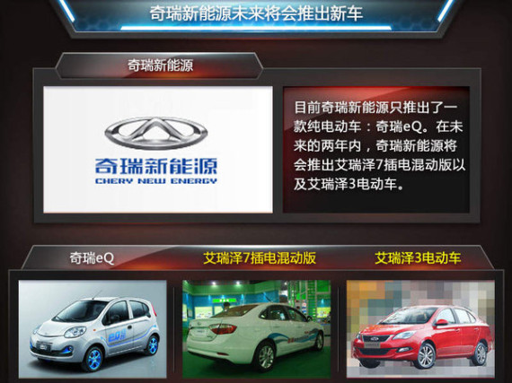 奇瑞新能源方面,刚刚上市的奇瑞eQ凭借最大巡航里程大于200公里而获得了不少的好评,为了进一步丰富新能源车型,奇瑞计划在2015年再推出两款新车,艾瑞泽7插电混合动力车型以及艾瑞泽3电动车。