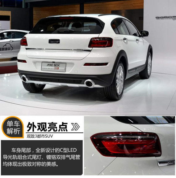 观致3都市SUV在外观上基本沿用了五门版车型的设计语言,只是对部分细节做了微调。从车头来看,新车依旧采用了大面积的镂空状中网,圆形的雾灯也使得观致3都市SUV看上去更富有活力。值得一提的是,观致3都市SUV还配备了LED日间行车灯,车身侧面线条立体流畅,宽大的C柱设计很好地满足后排乘客乘坐空间的需求。车身尾部,全新设计的C型LED导光轨组合式尾灯、镀铬双排气尾管均体现出极致对称的美感。