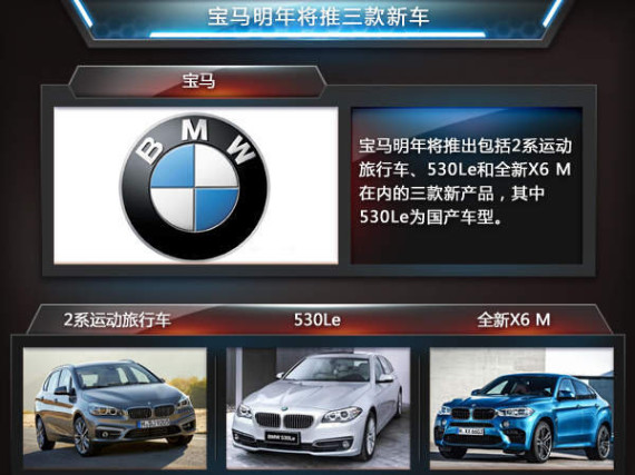 根据宝马对于明年所制定的相关规划,在新车方面将包括2系运动旅行车、530Le以及X6 M,其中关于上述三款车型的上市时间,王洪也表示:“BMW第一款前驱车,BMW 2系运动旅行车会在明年年初上市;宝马全球第一款插电式混合动力豪华商务轿车530Le农历马年结束之前推出;而新X6 M也会在明年年中上市。”