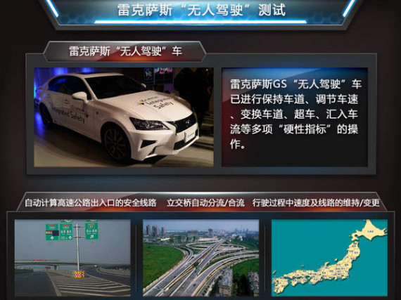实际上,雷克萨斯“无人驾驶”车经过上述多项前瞻技术以及安全系统的应用,在日本本土与美国等地主要针对在城市道路、高速公路完成规划线路、合流/分流、控制行驶速度等多项测试,技术与安全性已逐步成熟,即将在12月投入使用的GS“无人驾驶”车就充分地说明了这一点。
