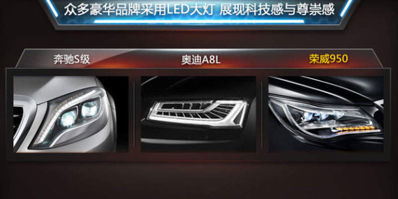 LED大灯的造型设计通常都彰显着产品的特质与车主的品位,为此新荣威950前灯组也颇具韵味的采用这种全新设计。目前国内众多豪华车也多以全LED大灯展示前瞻的科技感与时尚感,如奔驰S级轿车、奥迪A8L、雷克萨斯NX、讴歌RLX等车型。