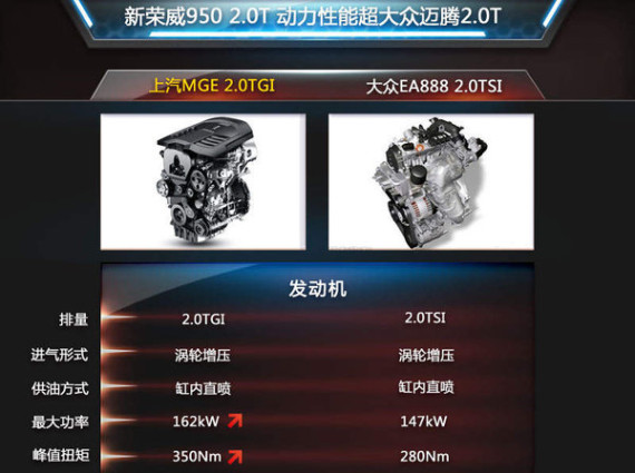 目前国内市场上热销的B级轿车一汽-大众迈腾搭载的也是2.0TSI直喷增压发动机,发动机代号为EA888,最大功率为147kW,峰值扭矩达280Nm。显然在关系到动力输出的性能指数上,或是显然,新荣威950所搭载的2.0TGI发动机与大众迈腾的2.0TSI已是相差无几。