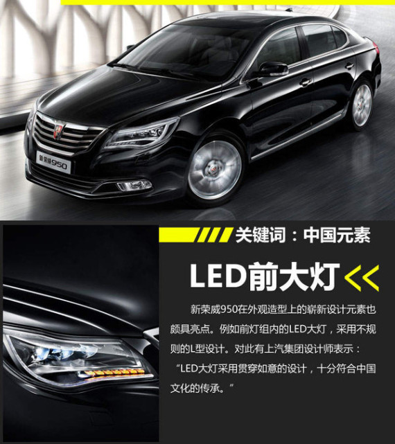 此次在广州车展上发布的新荣威950,除了在动力系统上的全面升级外,在外观造型上的崭新设计元素也颇具亮点。例如前灯组内的LED大灯,采用不规则的L型设计。对此有上汽集团设计师表示:“LED大灯采用贯穿如意的设计,十分符合中国文化的传承。”