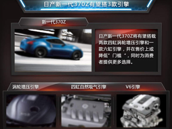 在面对明年实行的更为严苛的排放标准背景下,大多数车企主力家用车型已陆续换搭小排量增压引擎,以保证强劲动力输出同时兼具低排放的目的,这一点也即将体现在跑车上。就在不久前广州车展中,日产入门级跑车-370Z的年款车型正式推出,尽管上市时间不长,但该车仍有望在明年迎来换代车型。近日,我们从海外媒体Car Advice了解到:日产下一代370Z将搭载包括涡轮增压在内的3款引擎,售价方面也将有望下调。