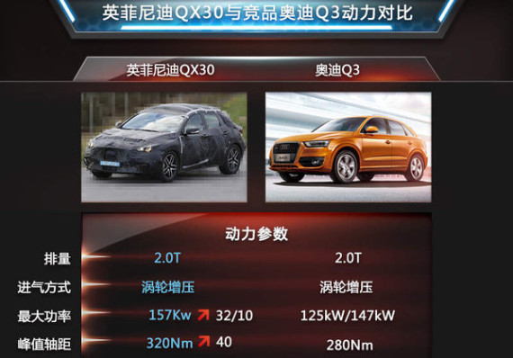 在豪华品牌紧凑型SUV中,奥迪Q3 凭借其自身的品牌以及价格优势有着良好的市场表现。而此次英菲尼迪全新QX30将竞争对手锁定奥迪Q3,有意在紧凑型SUV中占领市场。现款奥迪Q3搭载的2.0T引擎,最大动力输出有125Kw、147kw两种,峰值扭矩达到280Nm。英菲尼迪QX30或以157Kw的最大功率以及320的峰值扭矩略胜一筹。