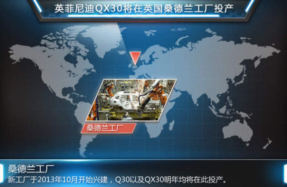 目前英菲尼迪在全球范围内拥有美国田纳西州士麦那工厂、日本枥木工厂两大生产基地,在去年10月,第三基地英国桑德兰工厂开始创建,预计明年正式完工。值得关注的是,英菲尼迪紧凑型SUV QX30将于明年在第三工厂生产。此外,英菲尼迪Q30与日产Juke以及逍客也同在此工厂进行投产。