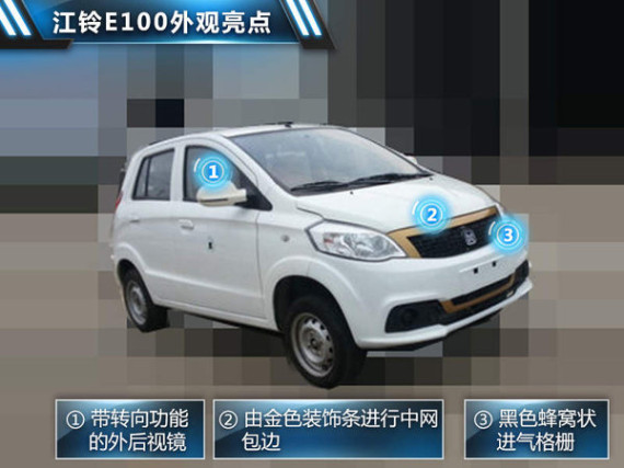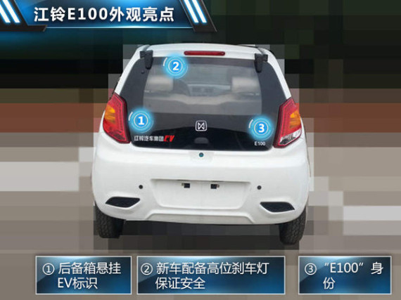 江铃E100纯电动车的外观造型中规中矩,蜂窝状黑色进气格栅在金色装饰条的衬托下,显得十分具有辨识度。带转向功能的外后视镜和车尾处配备的高位刹车灯共同保障了行车安全。值得一提的是,新车在后备箱左下方悬挂的红色“EV”标识很好地说明了其纯电动车的身份。