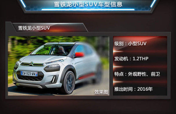 随着消费者用车需求日渐细化,车型的定位也愈加丰富,良好的燃油经济性和较为低廉的价格,使小型SUV得到更多的关注。这也让更多的厂商涉足小型SUV领域,使其成为SUV家族中不断壮大且极具市场潜力的一支生力军。雪铁龙就是众多看好小型SUV市场的品牌之一,网通社近日从德国媒体autobild获悉:雪铁龙小型SUV将有望搭载1.2THP高效引擎,并于2016年正式推出。此外,新车将与福特翼搏、菲亚特500X等同级别车型展开竞争。