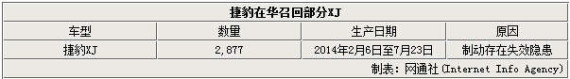 捷豹路虎去年在全球销售76,668辆车,同比提升42.4%。目前旗下XF、XJ及高性能车型XK均已更新换代,为捷豹品牌全球销量增长做出贡献。近日,网通社从国家质检总局官方网站获悉,因制动存在失效隐患,捷豹将在华召回部分2014和2015款XJ轿车。据统计,将有2,877辆车受到影响。
