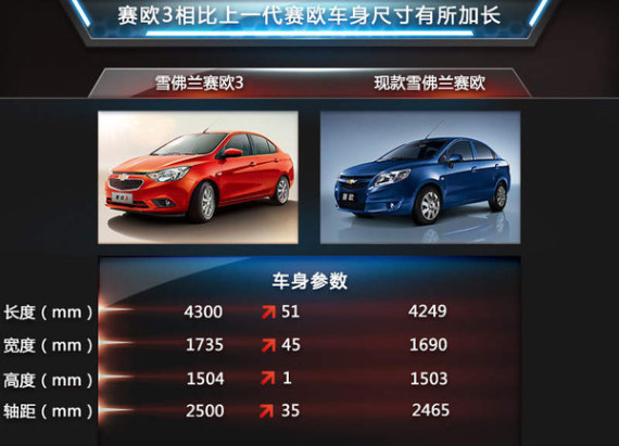 采用通用全新小型车平台打造的赛欧3“三围”较现款车型有了全面提升,长宽高分别为4300/1735/1504mm,轴距为2500mm。相比现款车型长度加长51mm,车宽加长45mm,轴距加长35mm。这个数据,味着赛欧3可以拥有更加宽大的储物空间和驾乘空间,也让它在与同级别小型车竞争时更有底气。配置升级的赛欧上售价或将上调,预计6万元起售。