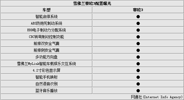 根据官方公布的数据看,赛欧3的安全配置十分丰富,全系标配ABS防抱死制动系统、EBD电子制动力分配系统、CBC弯道制动控制系统、高配采用全方位4安全气囊。科技配置方面,赛欧3高配车型上集成了多功能方向盘、雪佛兰MyLink智能车载娱乐交互系统以及4.2寸彩色显示屏。MyLink智能车载娱乐交互系统可以支持智能手机映射,实现手机和显示屏双屏互联,同时该系统还有自然语音识别和蓝牙音乐播放等多种功能。