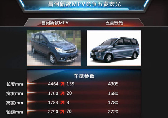 昌河新款MPV在车身尺寸上要略长于福瑞达M50,车身长宽高分别为4464/1700/1783mm(安装行李架高度变为1855mm),不过轴距相当,同为2790mm。