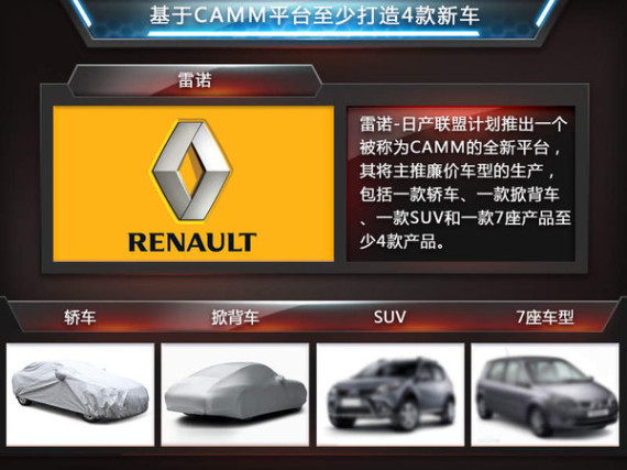 雷诺在推出名为Logan的廉价车型之后获得了不错的市场效果,这激励了雷诺开拓廉价车市场的雄心。廉价车只是一个相对概念,并不代表其质量差,因此除将推出轿车、掀背车外还有SUV以及7座的MPV或SUV车型。这些车型均出自雷诺-日产联盟打造的CAMM平台。