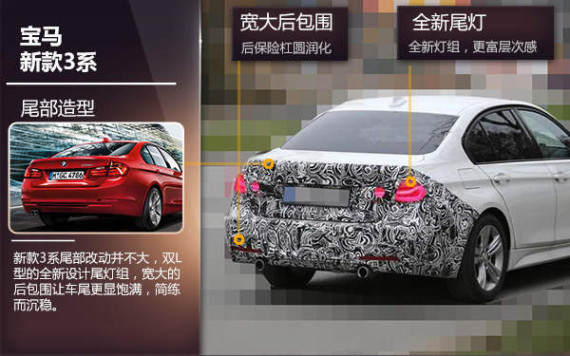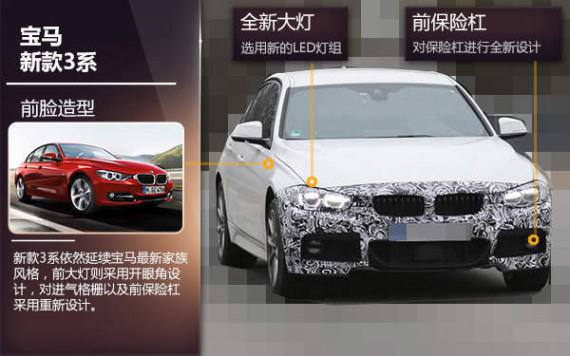 宝马计划在2015年3月的日内瓦车展上正式发布改款3系,在外观方面其仍将延续家族式设计风格,前保险杠、进气格栅等细节上将会采用新的设计。动力方面将提供多种选择,包括全新3.0T双增压发动机,另外,为了迎合小排量增压的发展趋势,3系入门版车型还有望搭载宝马最新的1.5T三缸发动机,提升燃油经济性。