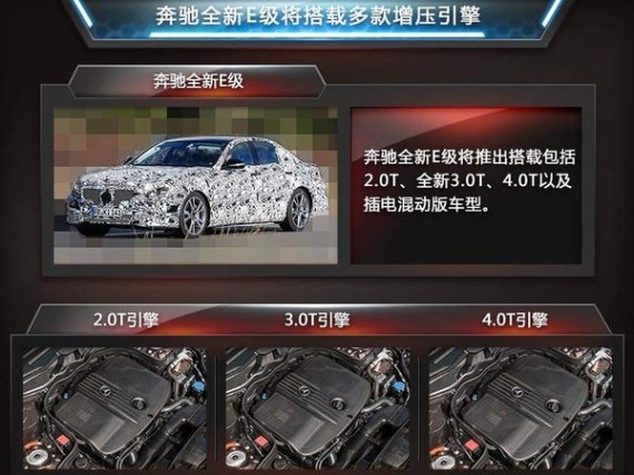动力方面,全新E级最大的变化是现有的V6发动机将不再使用,其将采用新一代的3.0升直列6缸发动机。此外,新一代E级车还会推出插电式混合动力车型,搭载多种不同输出的电动机。传动方面,全新奔驰E级将匹配9速自动变速箱,这也将使得车辆的换挡更加平顺,而AMG版本则使用高功率调教的全新4.0T发动机。