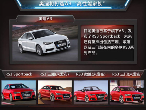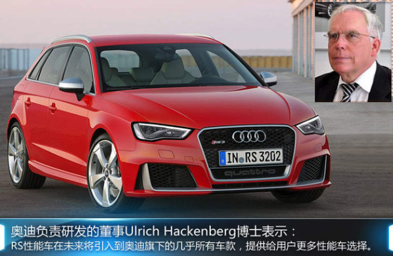 RS系列是奥迪旗下高性能改装部门,其产品代表了奥迪对于运动及速度的最高诠释。对于未来该部门的发展以及产品规划,奥迪负责研发的董事Ulrich Hackenberg博士表示:RS性能车在未来将引入到奥迪旗下的几乎所有车款,从而提供给用户更多的性能车选择。而目前奥迪A3已推出了敞篷版、三厢版等多种衍生车型,因此未来上述车型均推出相应的RS产品也在情理之中。
