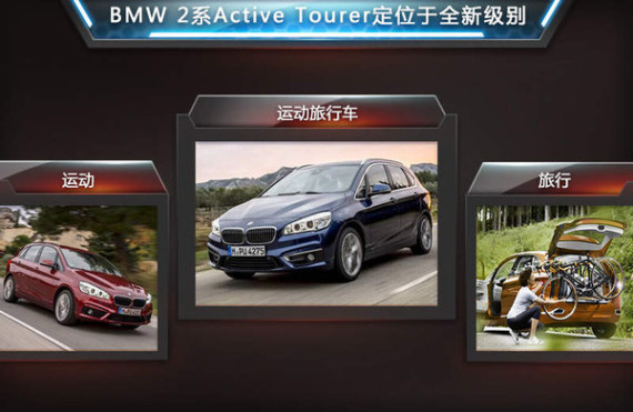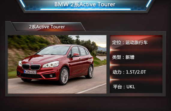 2系Active Tourer在2014年3月开幕的日内瓦车展上全球首发,其所采用的UKL平台,使该款产品成为了BMW首款前驱产品。新车型在保证传承本品牌内设计特性的同时,旅行车的外观造型也使其成为BMW产品线中特殊的一员。另外虽定位在旅行车市场,但其仍保留了BMW一贯对于运动性能的专注,也因此“运动旅行车”应允而生。