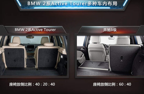 同时储物能力作为一款旅行车最为重要的作用,BMW 2系Active Tourer相比奔驰B级而言更有优势。其中在储物空间部分,前者拥有诸如方向盘左侧储物格,可变空间的中央扶手箱,以及后排中央扶手等,而上述配置在奔驰B级上均为匹配,另外BMW 2系Active Tourer后排座椅40:20:40的放到比例也相比奔驰B级传统的40:60分割方式更具灵活性。