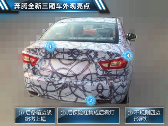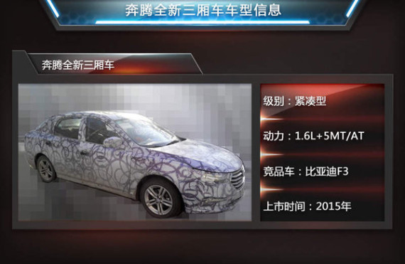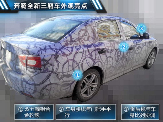 近日,媒体获得了一组奔腾全新三厢车的谍照,据了解,这款车或将被命名为奔腾B30,该新车最快将于2015年正式上市。根据其市场定位,竞争对手则为比亚迪全新F3等车型。该车也是奔腾未来5年规划的首款全新车型。