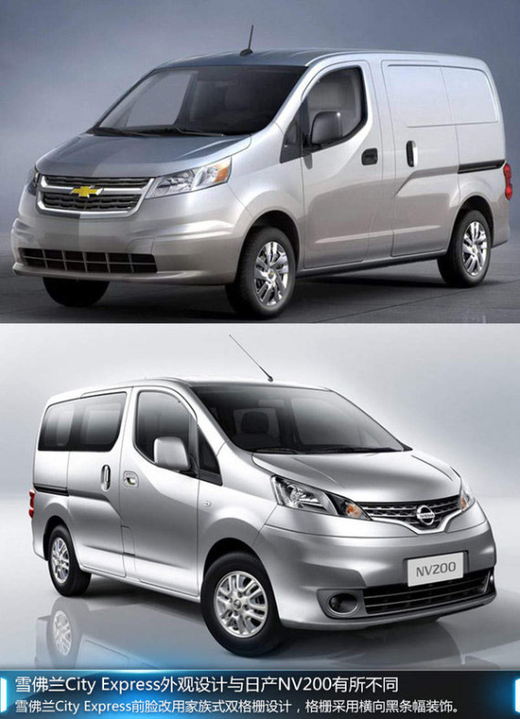 雪佛兰City Express基于日产NV200打造新产品,2013年5月通用和日产达成合作协议,生产换装雪佛兰标识的NV200车型,改变通用产品序列中缺乏小型商用车型的现状,所以两款车型的动力总成与零部件配置基本保持了一致。据海外媒体报道,目前该车已正式投产,有望于年内在北美市场上市,起售价为2.295万美元(约合12万元人民币)。新车上市后将与同级别车型市场上的福特全顺展开竞争。