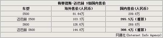 目前奔驰S 600在海外的售价为16.42795万欧元(约合人民币126.6万元),而S 600在国内售价则为269.8万元人民币。近日奔驰也正式公布了迈巴赫S级轿车在海外的售价,迈巴赫S 500车型13.4053万欧元(约合人民币103.3万元), 迈巴赫S 600车型18.7841万欧元(约合144.8万元),结合来看预计迈巴赫S 500在中国的售价或将为265.5万元左右,迈巴赫S 600的售价将达到308.4万左右。
