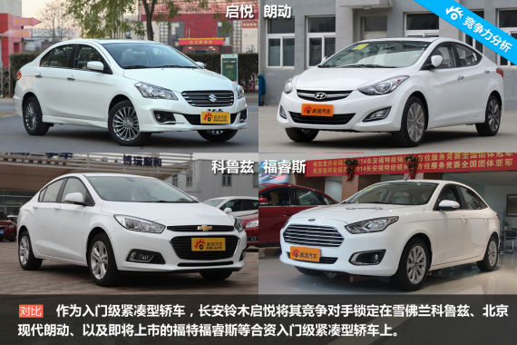 作为入门级紧凑型轿车,长安铃木启悦将其竞争对手锁定在雪佛兰科鲁兹、北京现代朗动、以及即将上市的福特福睿斯等合资入门级紧凑型轿车上。从车身尺寸上来看,长安铃木启悦在车身长宽高等硬指标上优势并不明显,但与其竞争对手相比差距也并不是很大,应该可以满足日常家庭的用车需求。