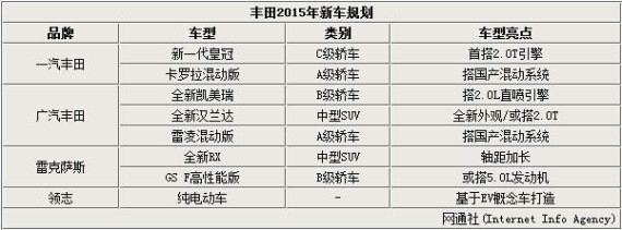 丰田全新一代皇冠以及全新凯美瑞此前已正式发布,两车作为一汽丰田与广汽丰田各自旗下的旗舰车型,在动力总成上都作出了调整,并将在明年推向市场,以进一步提升品牌形象。不过基于2015年将实施更为严格的排放标准,丰田在华也将增加更多新能源车型,据了解,卡罗拉混动版、雷凌混动版?包括今年发布的广汽丰田合资自主品牌领志纯电动车均将在明年上市。不得不提到的是,卡罗拉与雷凌均将匹配国产混合动力系统。近日,媒体对丰田2015年将上市新车型进行梳理后发现:丰田(含雷克萨斯品牌)将有包括卡罗拉混动版在内的8款新车问世,动力总成无疑是这些车型最大的亮点。