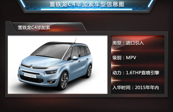 全新C4毕加索是东风雪铁龙在整合销售渠道之后引进国内的首款进口车型,并将成为2015年雪铁龙在华主推的进口车。全新Grand C4 Picasso在引进之后或将命名为雪铁龙大C4毕加索,该车采用2+3+2的座椅布局,圆润的外观沉稳大气,比较符合国人的审美观念。这款全新的7座MPV基于EMP2平台打造,在动力方面将采用PSA当红的1.6THP直喷引擎并搭载6速手自一体变速箱。此外,全新C4毕加索的5座车型也将同步引进。