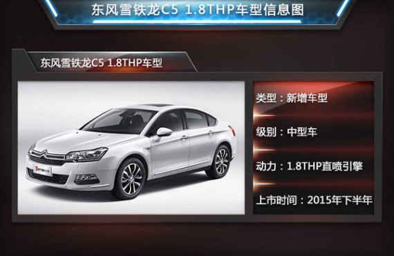 根据神龙公司 “E动战略”的推行,东风雪铁龙对目前旗下唯一的一款中型车进行了动力升级,以1.6THP引擎取代了2.0L自然吸气引擎。随着1.8THP引擎在2015年投产,东风雪铁龙将用该款引擎取代2.3L自然吸气发动机,作为T时代新C5高配车型的全新动力系统。1.8THP发动机除延续1.6THP发动机技术外,还采用了新的缸体,活塞,连杆机构、进排气系统等设计和零部件结构。在保留THP系列发动机出色燃油经济性的同时,1.8THP引擎的动力输出更为强劲,其最大功率为150kW,峰值扭矩达到280Nm,从参数上看超越了大众集团的1.8TSI和2.0TSI。