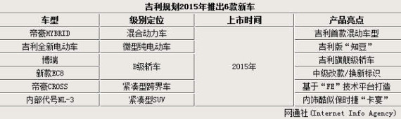 吉利汽车在经历了短暂的产品阵痛期后,于今年下半年迎来强势复苏,陆续投放了新帝豪、豪情SUV以及新远景3款车型,并且随后还发布了旗下全新中高端轿车——博瑞。在产品线得到进一步丰富后,吉利又谋求在更多细分领域有所斩获。这其中,作为未来汽车发展趋势的新能源汽车自然是布局重点。近日,媒体通过对吉利汽车2015年的产品规划进行梳理后发现:吉利将有望推出包括帝豪HYBRID、帝豪CROSS、全新紧凑型SUV在内的6款新车。值得注意的是,在这些即将发布的新车中,新能源车型占到了高达1/3的比重。