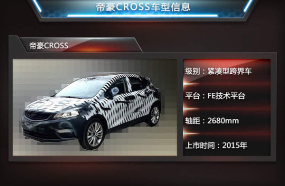 帝豪CROSS是吉利汽车基于新帝豪所打造的跨界车型,有望于2015年内正式上市。该车外观基本沿用了曾亮相过的“帝豪CROSS PHEV”概念车的设计理念,并在其基础上加入了一些更符合现实需求的设计元素。根据吉利内部规划,帝豪CROSS量产版将基于全新紧凑型轿车可拓展性生产平台“FE”平台打造。未来通过该技术平台将会衍生出如轿车、SUV以及新能源车等一系列车型。
