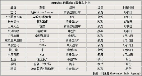 时至年末,各大车企都抓住这一时间,进行着年底“冲量”的销售策略。2014年即将过去,在这一年里国内的汽车市场呈现出先热后冷的销售态势,而2015年的国内车市又将如何实则难料。很多品牌为了在新年伊始能够获得良好的销售开端,已为即将到来的2015年“排兵布阵”。将要上市的新车当中不乏多款车型值得我们去关注,下面我们经过汇总将为您逐一介绍有望在2015年1月上市的13款新车,其中6款SUV车型将领衔新车上市阵容。
